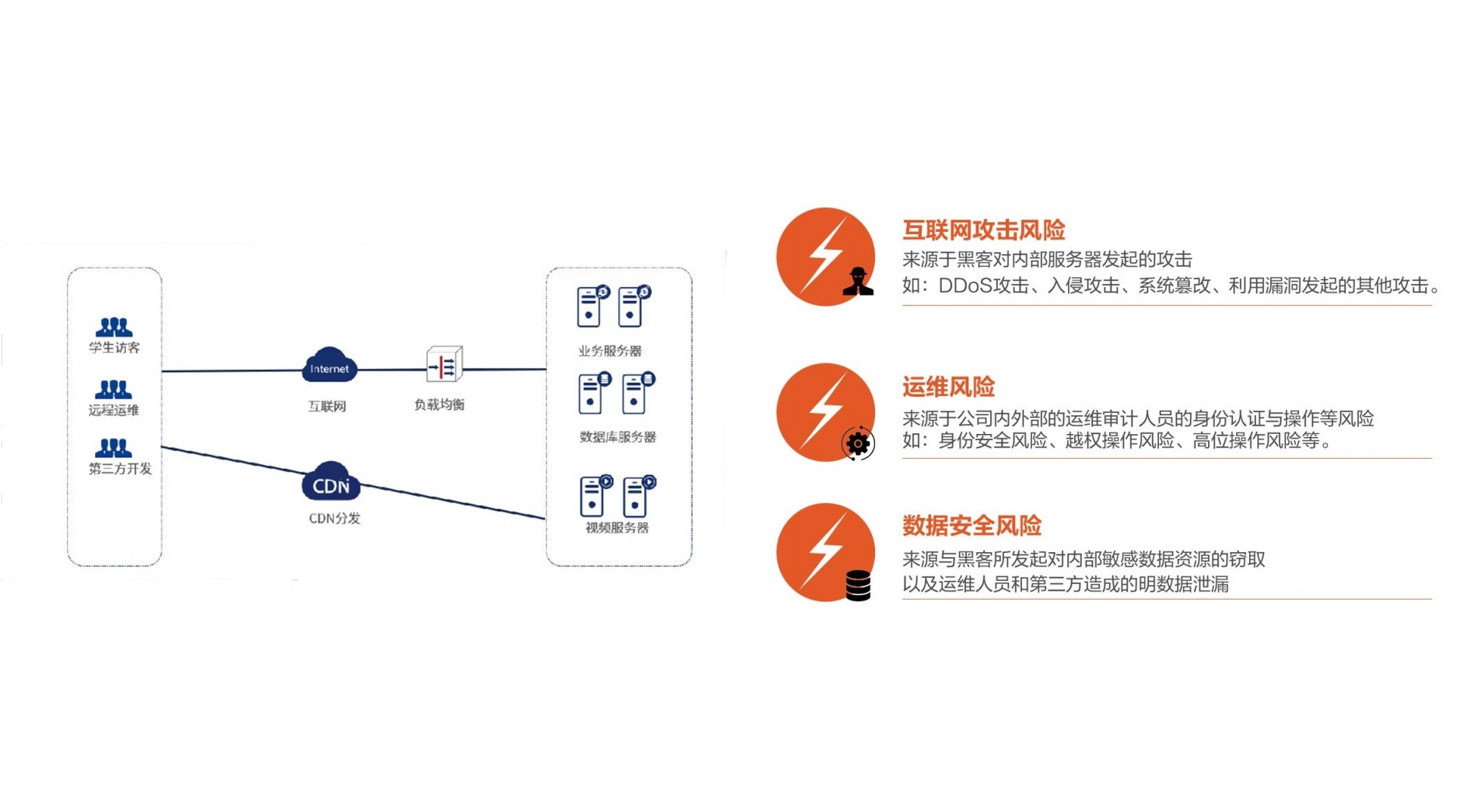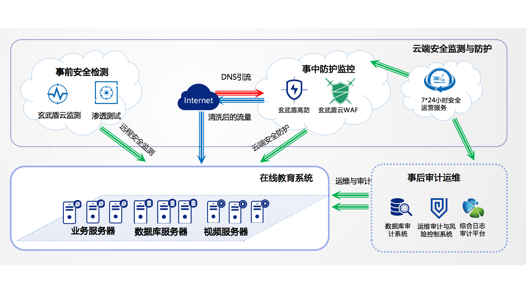 · 事中:免接触式部署,10分钟防护见效;最大2.5T DDoS/CC清洗,保障系统永久可用;有效拦截黑客入侵攻击,防黑、防师生数据泄露、防篡改;一键关停受控系统,免除通报