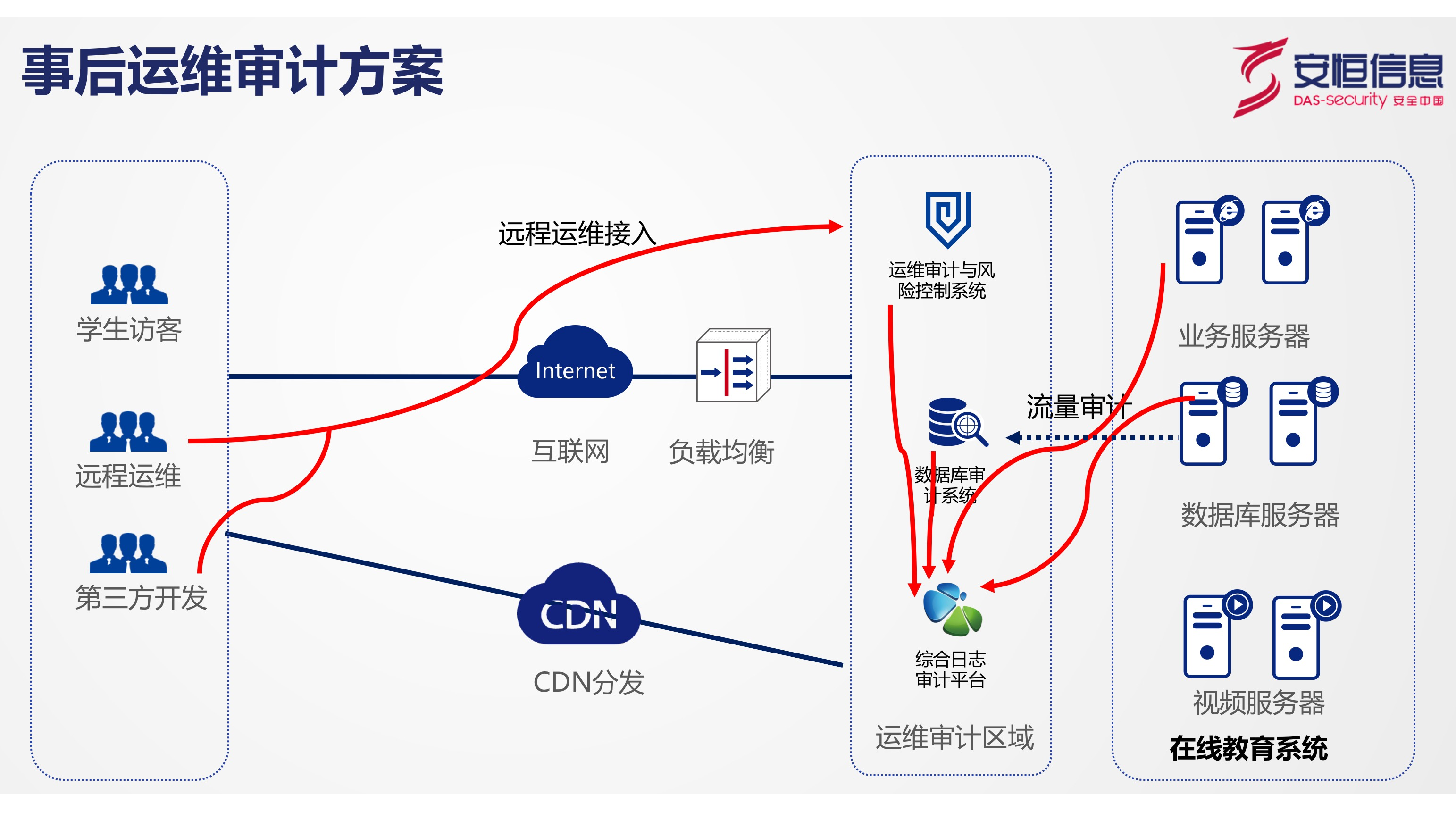 · 远程运维系统时,先通过VPN登陆到运维审计与风险控制系统进行身份验证后,然后通过运维审计跳板机登陆到服务器进行远程运维,运维过程全程记录,保障运维安全